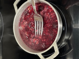 In a small sauce pan, add the raspberries with the water and let it simmer for about 10 minutes at medium heat.